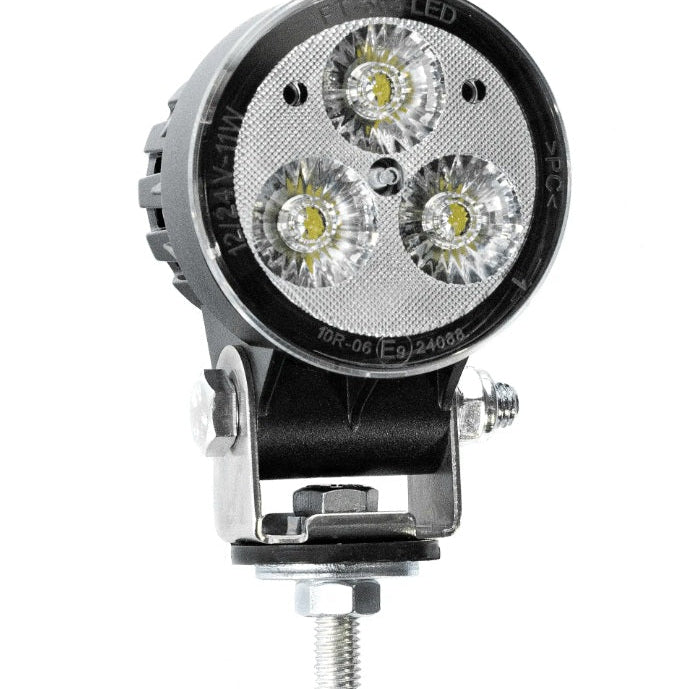 Durable round LED work light for tractors, off-road vehicles, and motorcycles. 11W, 1200 Lumens, IP69 waterproof, E-mark certified. Reliable lighting for demanding jobs.